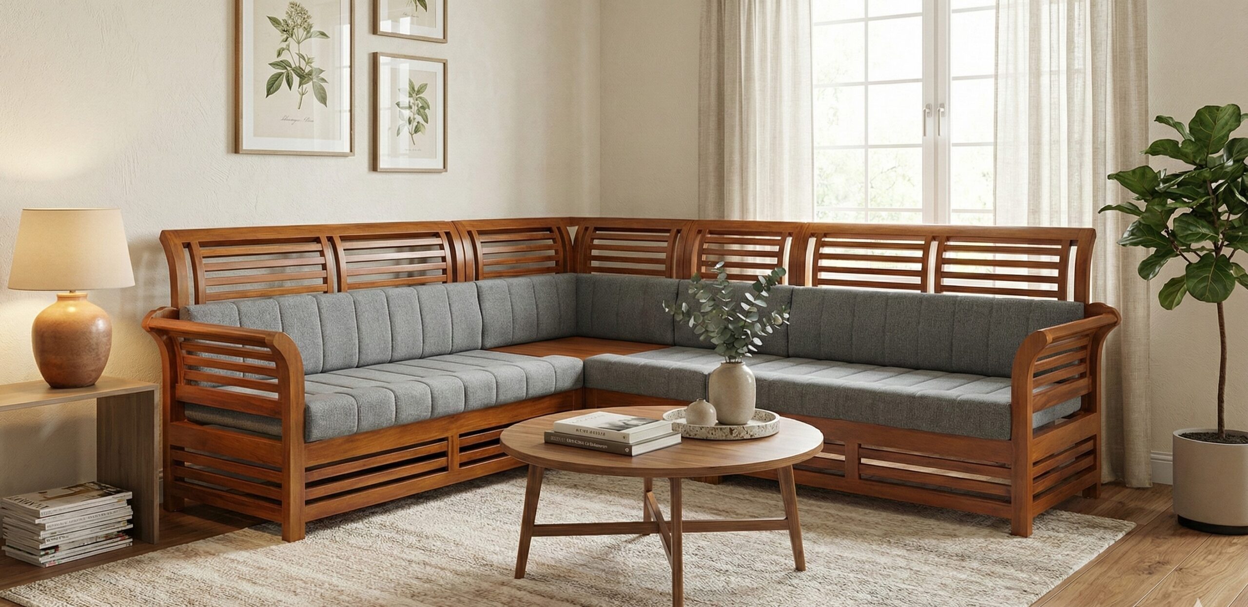 Made up of   kerala teak wood upholstered with high density u foam and fabric.Price only for setty ,Teapoy at extra cost